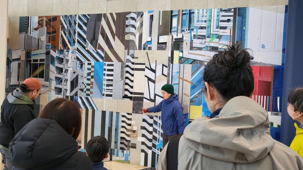 カフェの前に設置された岩竹理恵の作品「測度空間 – Z軸の行方」は、二次元とも三次元とも見極めつかない不思議な空間構成が見飽きません。貼り込まれた作品と元からの壁と見分けがつかない不思議が造形をどのように制作されたのか作者に語っていただきました。