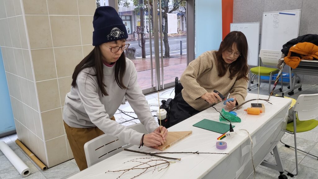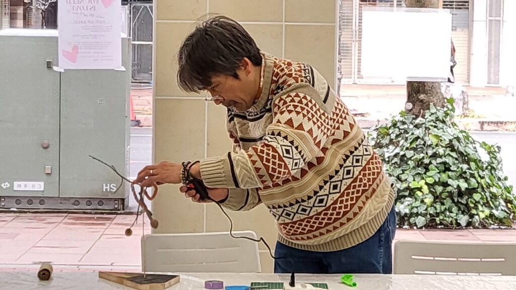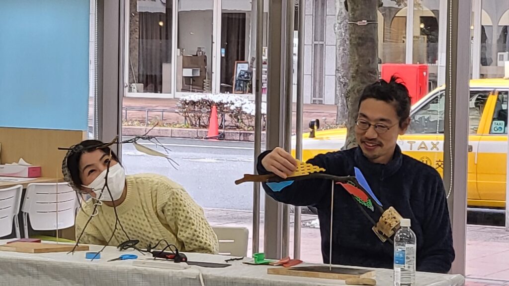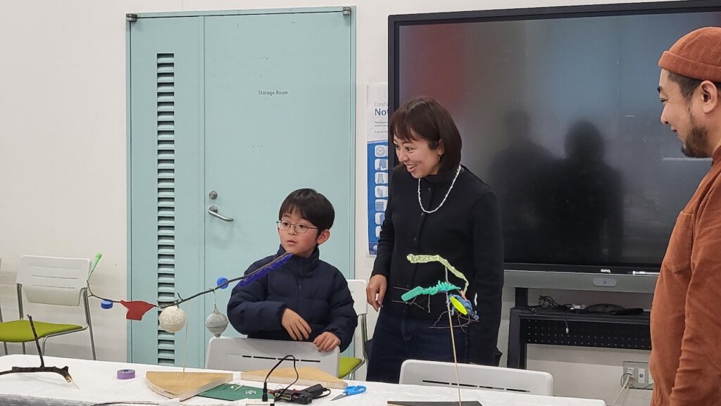 アーティストからのもう少し竹ひごを短くすると回りやすいかもなど、丁寧な指導受けながら、それぞれの作品が完成しました。