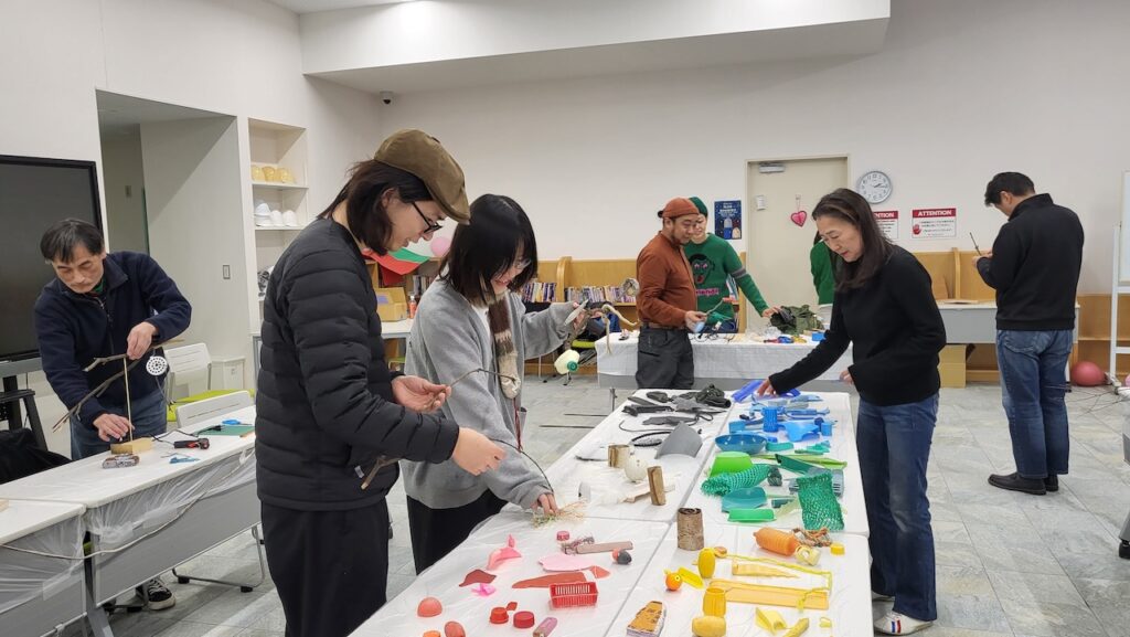 広げられた材質も形も色も様々な素材は、新潟の浜辺で集められた物。日本海での漂着物らしい数々です。このワークショップの数日前に、アーティストが集めてきたと聞いて、手に取る参加者の興味も一層増したようでした。