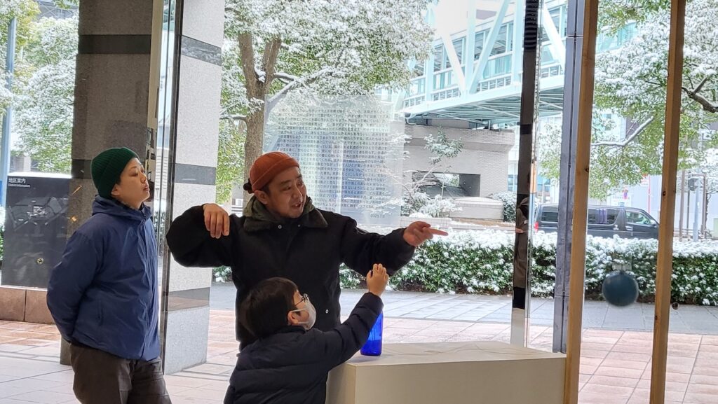 2月7日(土)と8日(日)は小雪舞い散る中、まずはYCSアトリウムで集合し、作品を見ながらアーティストからの説明を聴きました。