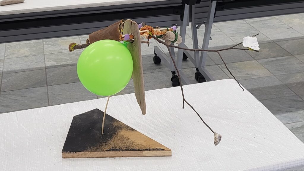最後に、参加者おひとりおひとりから、何をイメージしたのかとか、どうしてその素材をつかったのか、など作品制作の意図を発表していただきました。出来るだけ多くの素材を使おうとされた方、色合いにこだわった方、最初に手に取った素材ボールを活かしてバランス良く降り下げて綺麗に回転する作品を制作された方などなど、皆さんそれぞれの工夫が凝らされた作品となりました。