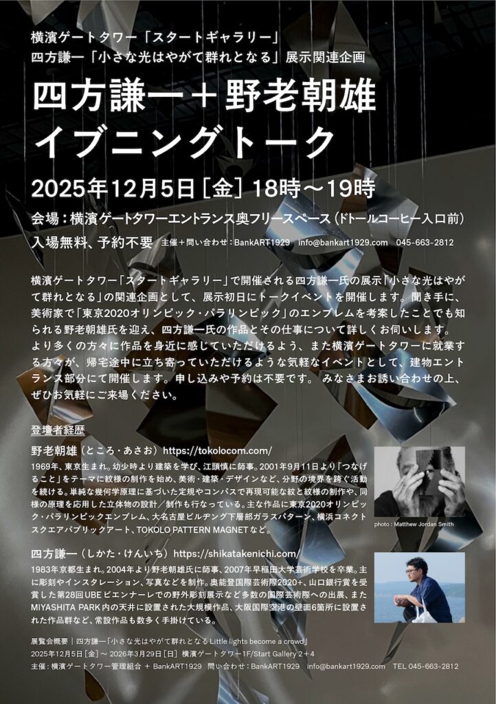 みなとみらい 四方謙一+野老朝雄 イブニングトーク 2025年12月5日 四方謙一+野老朝雄 イブニングトーク開催日時:2025年12月5日(木)18時〜19時会場:横濱ゲートタワーエントランス奥フリースペース(ドトールコーヒー入口前)入場無料、予約不要主催+問い合わせ:BankART1929
