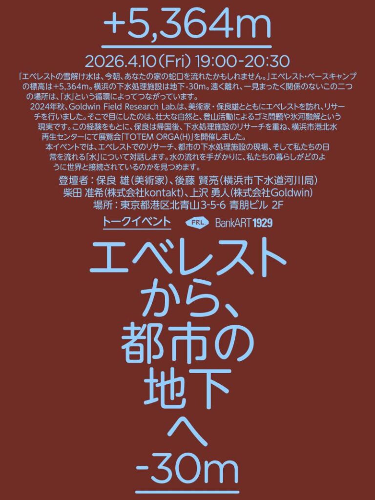 横浜の下水処理施設は、地下 -30m。遠く離れ、一見まったく関係のないこの二つの場所は、「水」という一本の線でつながっています。2024年秋、Goldwin Field Research Lab.は、美術家・保良雄氏とともにエベレストを訪れ、リサーチを行いました。