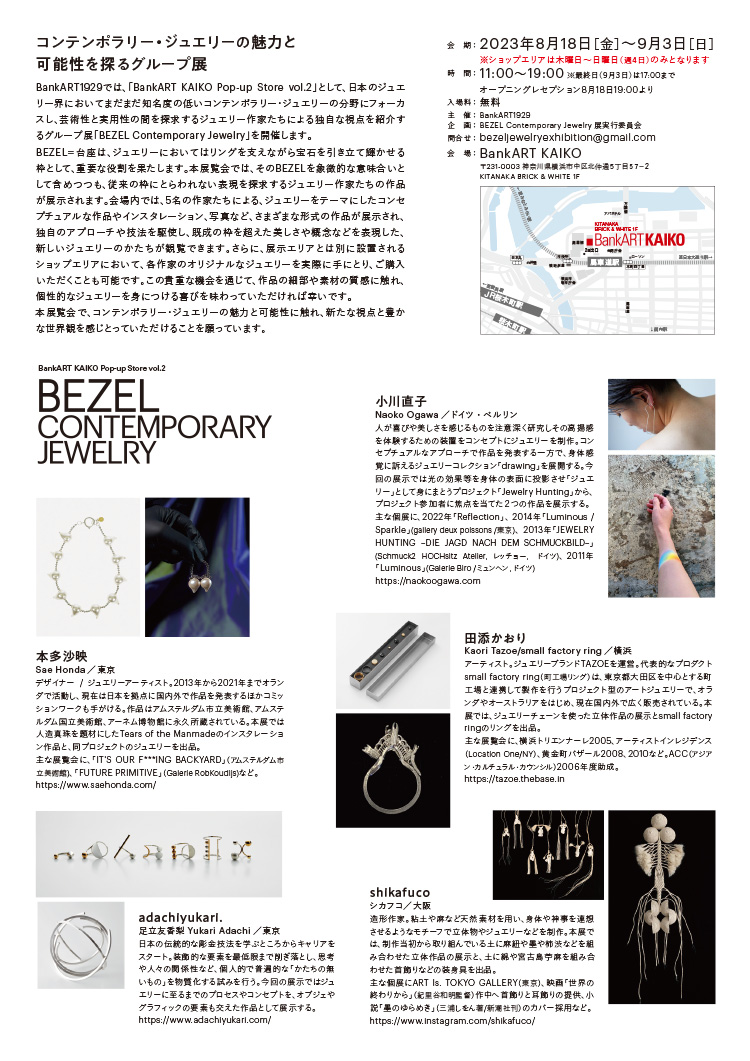 BankART1929では、「BankART KAIKO Pop-up Store vol.2」として、日本のジュエリー界においてまだまだ知名度の低いコンテンポラリー・ジュエリーの分野にフォーカスし、芸術性と実用性の間を探求するジュエリー作家たちによる独自な視点を紹介するグループ展「BEZEL Contemporary Jewelry」を開催します。
